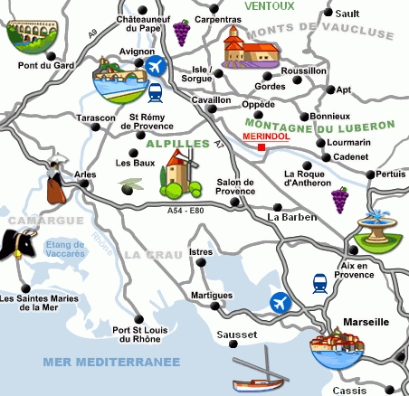 – randonnées et balades sur place (GR 6 et 97 à Mérindol, parcours sportif, bords de Durance…) et à proximité (Alpilles, Montagne Sainte Victoire, Camargue, calanques de Cassis…)